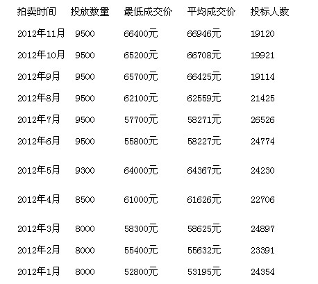 2012年11月上海私車額度拍賣結果今日出爐,在經歷上月車牌中標價小幅盤整之后,本月滬車牌拍賣價再次呈現上升勢頭,最低成交價66400元,平均成交價66946元,分別較10月上漲了1200元和238元,創下上海自2000年舉行私車私車額度無底價拍賣以來的最高紀錄。